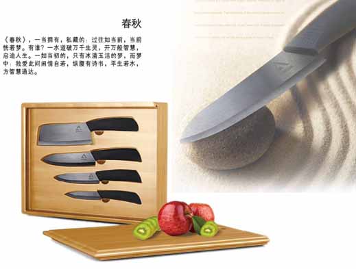 包装:竹盒+手提袋;手柄材质:ABS+TPE;刀片材质:纳米锆宝石材料精密合成;产品描述:6寸黑金陶瓷菜刀,6寸黑金陶瓷刀,5寸黑金陶瓷刀,4寸黑金陶瓷刀,配竹盒,且盒盖背面为菜板。