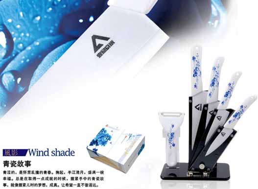包装:彩盒+手提袋;刀片材质:纳米锆宝石材料精密合成;手柄材质:骨质瓷;产品组合:7寸青花菜刀,6寸青花刀, 5寸青花刀,4寸青花刀,青花果皮削+刀架。