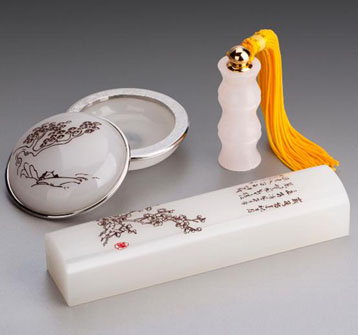 产品名称:岁寒三友 产品规格:(章)φ2 *6.7cm (印泥盒)φ6.5*3.1cm (纸镇)14.5*2.4*3cm 产品材质:白玉/铜镀金/韩国丝/银 产品寓意:坚毅不拨的青松,挺拨多姿的 翠竹,傲雪报春的冬梅,它们在岁寒中同 生,人们所敬慕。“岁寒三友”,以青松, 翠和冬梅比喻忠贞的友谊。